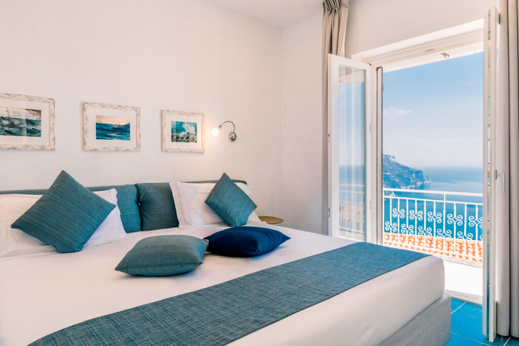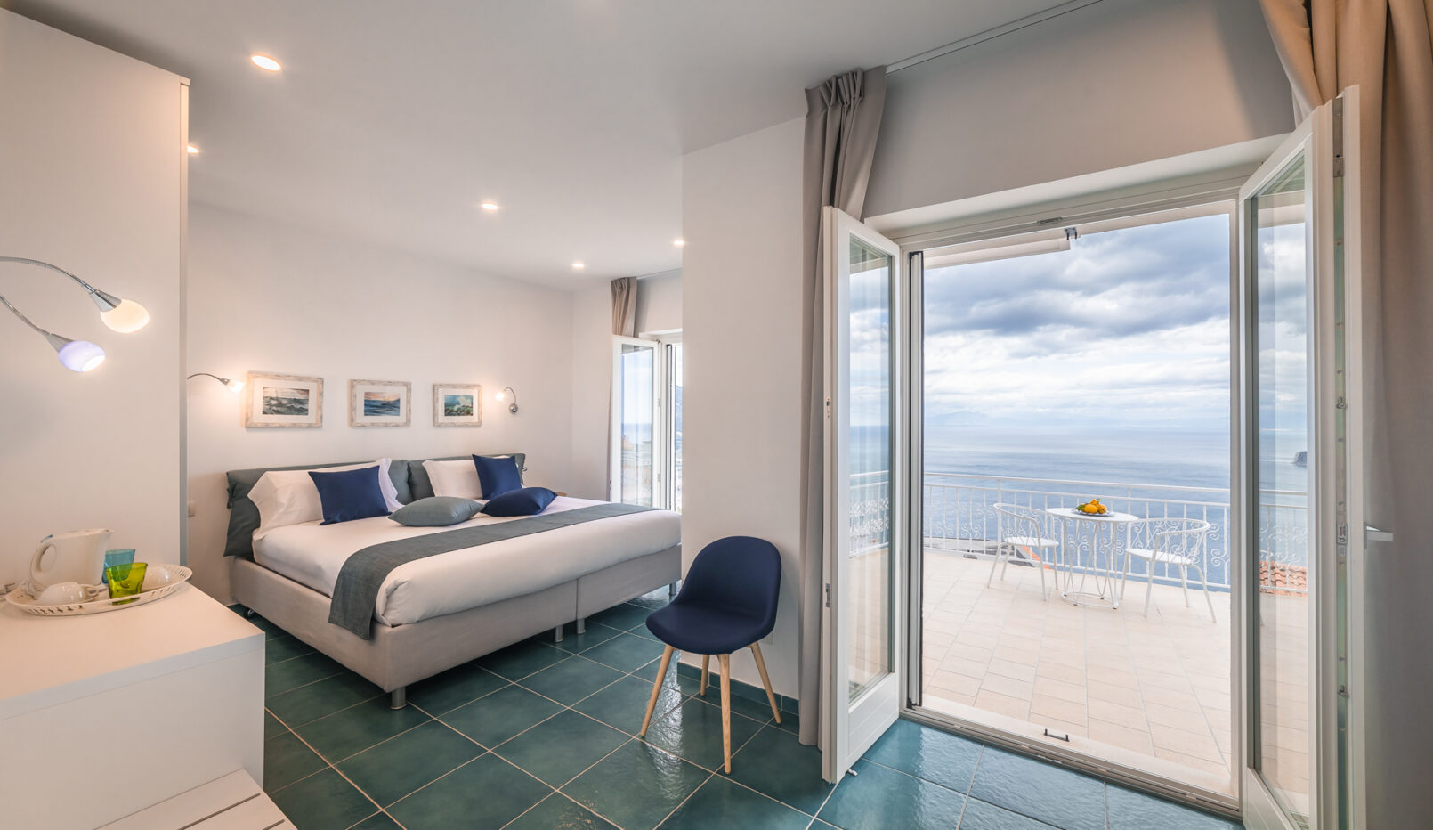 Some rooms offer private sea-view terraces, equipped with tables, chairs, and solarium areas, perfect for relaxing moments.